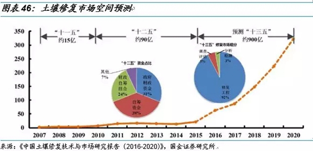 我們預(yù)計(jì)目前我國(guó)每年的土壤修復(fù)市場(chǎng)在150-200億之間,根據(jù)《中國(guó)土壤修復(fù)技術(shù)與市場(chǎng)研究報(bào)告(2016-2020)》的預(yù)測(cè),“十三五”期間,我國(guó)土壤修復(fù)市場(chǎng)空間將達(dá)到900億,發(fā)展階段將進(jìn)入快速成長(zhǎng)期。