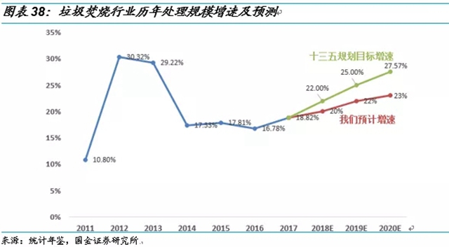其次,雖然我國(guó)垃圾焚燒處理率提高迅速,但跟規(guī)劃仍有較大差距。我國(guó)的垃圾焚燒行業(yè)在“十二五”經(jīng)歷了快速增長(zhǎng),垃圾焚燒處理率從2011年的18%迅速提升到了2016年的38%。《“十三五”全國(guó)城鎮(zhèn)生活垃圾無(wú)害化處理設(shè)施建設(shè)規(guī)劃》提出,“十三五”期間,全國(guó)規(guī)劃新增生活垃圾無(wú)害化處理能力50.97萬(wàn)噸/日(包含“十二五”續(xù)建12.9 萬(wàn)噸/日),其中垃圾焚燒處理設(shè)施規(guī)模2020年要達(dá)到59.14萬(wàn)噸/日。2017年的總處理能力達(dá)到30.4萬(wàn)噸/日,要完成2020年的目標(biāo),2018-2020三年的行業(yè)復(fù)合增長(zhǎng)率要達(dá)到24.83%。根據(jù)行業(yè)歷年增速及現(xiàn)有公司在建及籌建規(guī)模,我們預(yù)計(jì)2018-2020年行業(yè)增速分別是20%、22%和23%。