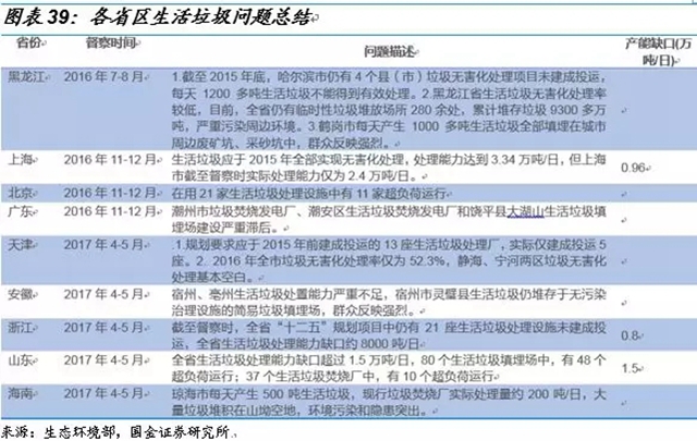 最后,我們通過(guò)生態(tài)環(huán)境部網(wǎng)站中的2016年到2017年的中央環(huán)保督察對(duì)全國(guó)31省區(qū)的督察反饋中發(fā)現(xiàn),垃圾焚燒產(chǎn)能的缺口確實(shí)存在且巨大。在31個(gè)省區(qū)中,其中有9個(gè)省區(qū)被督察到有生活垃圾無(wú)害化能力不足的問(wèn)題。例如:浙江省督察時(shí)發(fā)現(xiàn)全省“十二五”規(guī)劃項(xiàng)目中仍有21座生活垃圾處理設(shè)施未建成投運(yùn),全省生活垃圾處理能力缺口約8000噸/日;山東省全省生活垃圾處理能力缺口超過(guò)1.5萬(wàn)噸/日,80個(gè)生活垃圾填埋場(chǎng)中,有48個(gè)超負(fù)荷運(yùn)行。