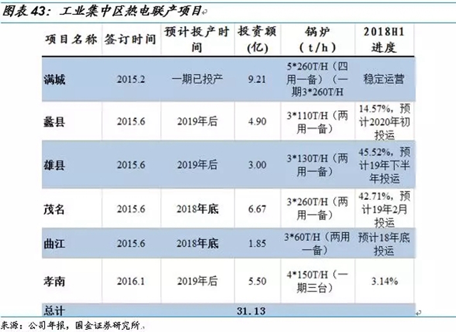 工業(yè)集中區(qū)熱電聯(lián)產(chǎn)業(yè)務(wù)方面,除了滿城熱電項(xiàng)目,公司還有其他5個(gè)項(xiàng)目。截至2018年6月底,雄縣、蠡縣項(xiàng)目進(jìn)展有所突破,將為雄安新區(qū)的基礎(chǔ)配套設(shè)施建設(shè)、為保定地區(qū)的大氣治理和節(jié)能減排作出貢獻(xiàn);茂名、曲江項(xiàng)目建設(shè)已接近尾聲,預(yù)計(jì)曲江項(xiàng)目于今年年底投運(yùn),茂名項(xiàng)目19年初投運(yùn)。