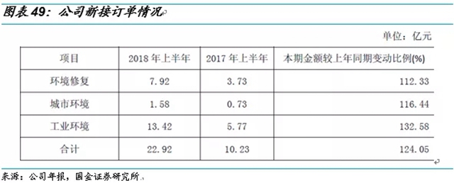 今年以來(lái),公司項(xiàng)目拓展速度明顯加速,上半年公司三大業(yè)務(wù)板塊環(huán)境修復(fù)、城市環(huán)境和工業(yè)環(huán)境的新增訂單增速分別是112%、116%和133%,總金額達(dá)到了22.92億元。18年上半年,公司環(huán)境修復(fù)板塊實(shí)現(xiàn)收入4.28億元,同比增長(zhǎng)64.29%。