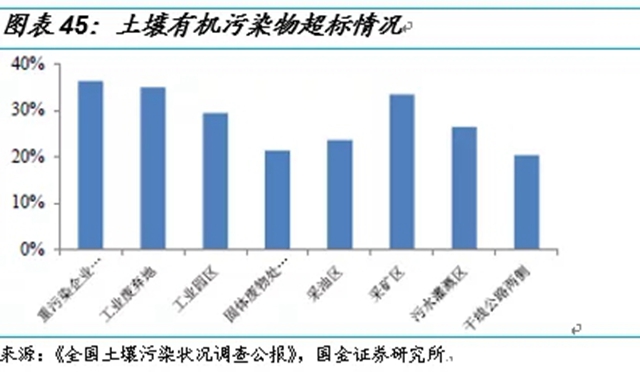 除了耕地污染,我國(guó)場(chǎng)地污染情況也很?chē)?yán)重。全國(guó)土壤污染狀況調(diào)研公報(bào)中,重污染企業(yè)、工業(yè)廢棄地和工業(yè)園區(qū)的有機(jī)污染超標(biāo)均達(dá)到和超過(guò)了30%。隨著我國(guó)城鎮(zhèn)化率的提高和城市建設(shè)面積的擴(kuò)大,很多重污染企業(yè)需要搬離城區(qū),這將產(chǎn)生很大的場(chǎng)地修復(fù)需求。