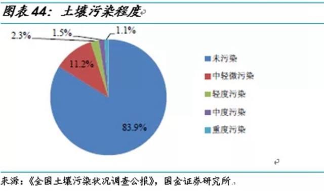 根據(jù)國(guó)土資源部數(shù)據(jù),最新全國(guó)耕地面積為 20.27 億畝。全國(guó)土壤污染狀況調(diào)查公報(bào)中,全國(guó)土壤總的超標(biāo)率為 16.1%;耕地土壤點(diǎn)位超標(biāo)率為 19.4%,其中輕微、輕度、中度和重度污染點(diǎn)位比例分別為 13.7%、 2.8%、 1.8%和 1.1%,其中重度、中度污染耕地區(qū)域面積高達(dá) 5878 萬(wàn)畝。