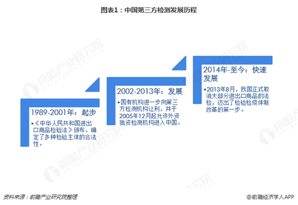 我國檢驗檢測起源于1989年,明顯晚于國外發(fā)達(dá)國家。其中《中華人民共和國進(jìn)出口商品檢驗法》的頒布,確定了多種檢驗主體的合法性。在這一階段我國檢驗檢測以國有機(jī)構(gòu)為主。2002年之后,國有機(jī)構(gòu)進(jìn)一步向第三方檢測機(jī)構(gòu)讓利,外資獨資檢測機(jī)構(gòu)也隨之被允許進(jìn)入中國市場,中國檢驗檢測市場主體規(guī)模有了根本性的改變。2014年以第三方檢測機(jī)構(gòu)為代表的我國檢驗檢測行業(yè)開始實現(xiàn)快速發(fā)展。