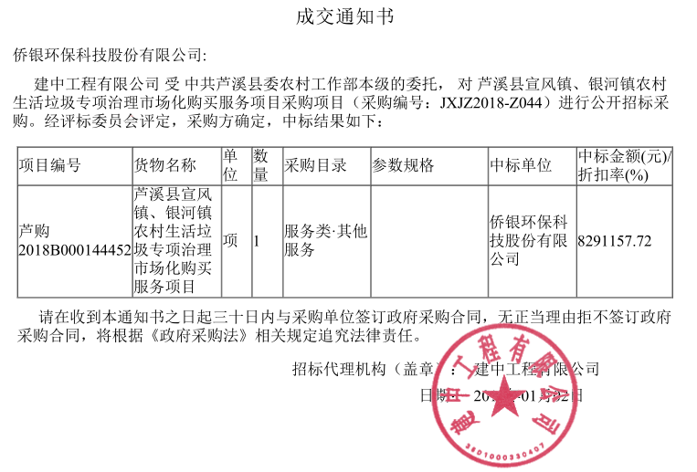 原標(biāo)題:829萬(wàn)/年,僑銀環(huán)保中標(biāo)江西蘆溪農(nóng)村垃圾治理項(xiàng)目