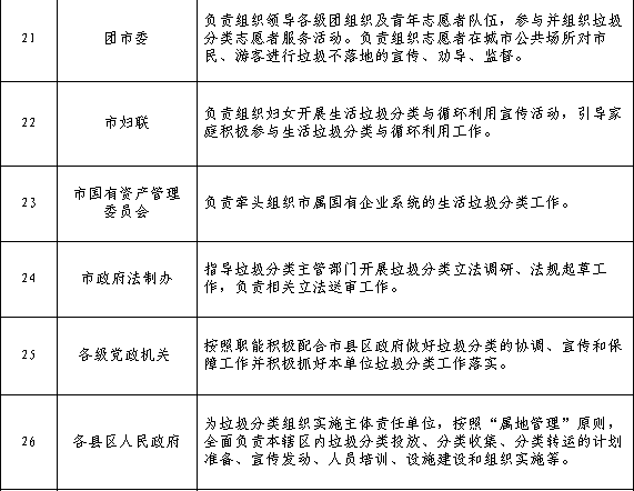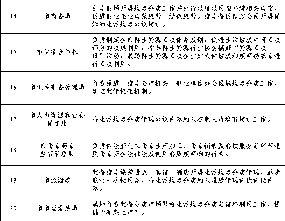 2020年前,在市城區(qū)、縣城區(qū)范圍內(nèi)實(shí)施生活垃圾強(qiáng)制分類。實(shí)施垃圾強(qiáng)制分類區(qū)域內(nèi)以下主體,負(fù)責(zé)對其產(chǎn)生的生活垃圾進(jìn)行分類。