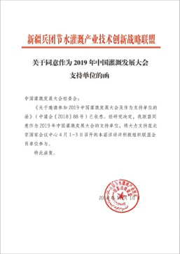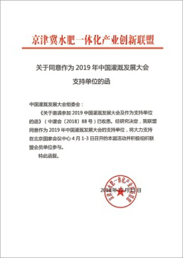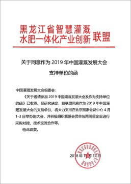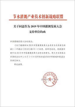 在2019年新年開(kāi)篇之時(shí),來(lái)自全國(guó)各節(jié)水灌溉聯(lián)盟及協(xié)會(huì)對(duì)中國(guó)灌溉發(fā)展大會(huì)的支持回函如雨后春筍般紛紛到達(dá),本周之內(nèi),中國(guó)塑料加工工業(yè)協(xié)會(huì)塑料節(jié)水器材專(zhuān)業(yè)委員會(huì)、中國(guó)生態(tài)農(nóng)業(yè)產(chǎn)業(yè)技術(shù)創(chuàng)新戰(zhàn)略聯(lián)盟、節(jié)水灌溉產(chǎn)業(yè)技術(shù)創(chuàng)新戰(zhàn)略聯(lián)盟、新疆兵團(tuán)節(jié)水灌溉產(chǎn)業(yè)技術(shù)創(chuàng)新戰(zhàn)略聯(lián)盟、京津冀水肥一體化產(chǎn)業(yè)創(chuàng)新聯(lián)盟、黑龍江省智慧灌溉水肥一體化產(chǎn)業(yè)創(chuàng)新聯(lián)盟紛紛致函組委會(huì),表示將大力支持在北京國(guó)家會(huì)議中心4月1-3日召開(kāi)的大會(huì)并積極組織相關(guān)會(huì)員單位參與同期活動(dòng)。