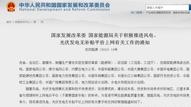 隨著風(fēng)電、光伏發(fā)電規(guī)?;l(fā)展和技術(shù)快速進步,在資源優(yōu)良、建設(shè)成本低、投資和市場條件好的地區(qū),已基本具備與燃煤標(biāo)桿上網(wǎng)電價平價(不需要國家補貼)的條件。為促進可再生能源高質(zhì)量發(fā)展,提高風(fēng)電、光伏發(fā)電的市場競爭力,現(xiàn)將推進風(fēng)電、光伏發(fā)電無補貼平價上網(wǎng)的有關(guān)要求和支持政策措施通知如下。