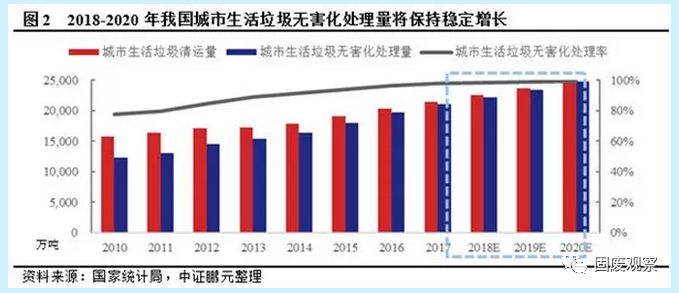 《“十三五”全國城鎮(zhèn)生活垃圾無害化處理設(shè)施建設(shè)規(guī)劃》(以下簡稱“垃圾處理十三五規(guī)劃”)指出,“十三五”期間全國規(guī)劃新增生活垃圾無害化處理能力50.97萬噸/日(包含“十二五”續(xù)建12.9萬噸/日),全國城鎮(zhèn)生活垃圾無害化處理設(shè)施建設(shè)總投資約2,518.4 億元。到2020年底,直轄市、計(jì)劃單列市和省會城市(建成區(qū))生活垃圾無害化處理率達(dá)到100%,其他設(shè)市城市、縣城(建成區(qū))、建制鎮(zhèn)生活垃圾無害化處理率分別達(dá)到95%、80%、70%以上。以2017年城市生活垃圾無害化處理率97.74%和城市生活垃圾清運(yùn)量增速5.69%為基準(zhǔn),假定無害化處理率每年上升0.06個百分點(diǎn),未來每年城市生活垃圾清運(yùn)量增速為5%(考慮經(jīng)濟(jì)下行壓力,保守估計(jì)),測算2018-2020年我國城市生活垃圾無害化處理量分別為2.22億噸、2.35億噸和2.48億噸。根據(jù)2018年9月中共中央、國務(wù)院印發(fā)的《鄉(xiāng)村振興戰(zhàn)略規(guī)劃(2018-2022年)》要求,推進(jìn)農(nóng)村生活垃圾治理、農(nóng)村污水處理、實(shí)施廁所革命、消除農(nóng)村黑臭水體、提升村容村貌是補(bǔ)齊突出短板的重要內(nèi)容。鄉(xiāng)村振興戰(zhàn)略作為2017年及2018年中央經(jīng)濟(jì)工作會議部署的重點(diǎn)工作,正逐步得到實(shí)施。隨著農(nóng)村未處理垃圾存量的消化和處理范圍擴(kuò)大,未來農(nóng)村垃圾處理規(guī)模有較大增長空間。