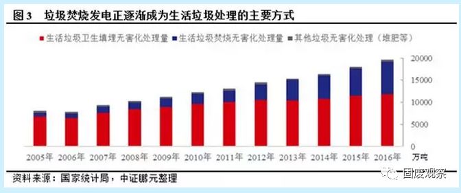 我國垃圾焚燒發(fā)電的投資發(fā)展可能提前完成“十三五”規(guī)劃裝機(jī)目標(biāo)。根據(jù)《生物質(zhì)能發(fā)展“十三五”規(guī)劃》,到2020年,生物質(zhì)發(fā)電總裝機(jī)容量將達(dá)到1,500萬千瓦,年發(fā)電量900億千瓦時(shí),其中農(nóng)林生物質(zhì)直燃發(fā)電700萬千瓦,城鎮(zhèn)生活垃圾焚燒發(fā)電750萬千瓦,沼氣發(fā)電50萬千瓦。截至2017年底,全國生活垃圾焚燒發(fā)電項(xiàng)目339個,累計(jì)并網(wǎng)裝機(jī)725.3萬千瓦,年發(fā)電量375.2億千瓦時(shí),垃圾焚燒發(fā)電共計(jì)處理城鎮(zhèn)生活垃圾約10,600萬噸。