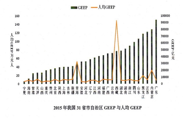 GEEP核算結(jié)果顯示,2015年,西藏、青海、內(nèi)蒙古、黑龍江和新疆是我國人均GEEP最高的5個省份,都超過11萬元/人,且人均GEEP都是其人均GDP的2.8倍以上。