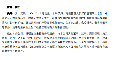 姚曙,男,漢族,1966年12月出生,本科學(xué)歷,高級管理人員工商管理碩士學(xué)位,中共黨員,教授級高級工程師。姚曙歷任深圳市中金嶺南有色金屬股份有限公司總裁助理兼凡口鉛鋅礦礦長、總裁助理兼礦產(chǎn)資源事業(yè)部部長、常務(wù)副總裁、黨委委員、董事局董事等職務(wù)。其在企業(yè)生產(chǎn)經(jīng)營管理方面具有豐富經(jīng)驗(yàn)。