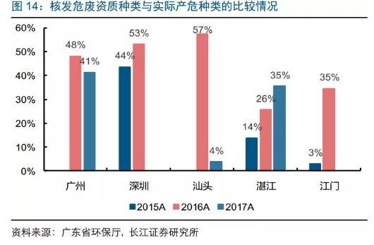 梅州/佛山/東莞/江門危廢產(chǎn)生量大于危廢資質(zhì)量(比例分別為457%、171%、102%、101%),危廢處置產(chǎn)能供給相對緊張;(危廢中國資訊公眾號:chinawaste)