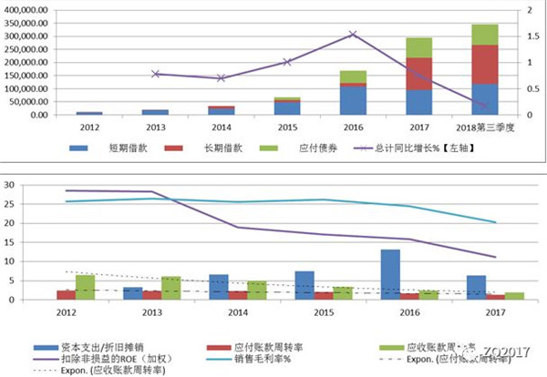 截至2018年第三季度,公司在建工程賬面余額約406,115萬元,是同期固定資產(chǎn)賬面價值的53倍,主要通過PPP業(yè)務(wù)模式開展。隨著業(yè)務(wù)擴張,近幾年公司的資本支出水平明顯, 2016年的資本支出/折舊攤銷高達13,同期的負債水平也明顯上升。2017年公司加大長期借款額度,長期負債占比上升至32,同比增加約50%。但企業(yè)的營運資金效率水平欠缺,自2016年,長期債務(wù)/營運資金比例明顯增加,2017年比值接近202,償債壓力顯現(xiàn)。而2015-2017年企業(yè)的經(jīng)營現(xiàn)金流凈額呈現(xiàn)負值,盈利空間下滑,而2016、2017的應收賬款占比在50%以上,且回款率有所降低,壞賬風險增加。基于此,公司未來的產(chǎn)能釋放和成本控制將對公司可持續(xù)經(jīng)營起到關(guān)鍵作用。2017年年報顯示公司的多個項目已經(jīng)完工轉(zhuǎn)入固定資產(chǎn),2018-2019年將開始投產(chǎn)。某種程度上和公司的組織調(diào)整相呼應。