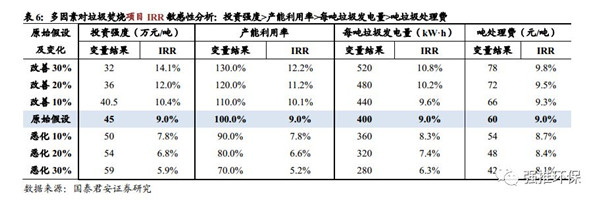 通過(guò)對(duì)典型垃圾焚燒項(xiàng)目盈利分析建模與敏感性分析,各種輸入變量中,對(duì)項(xiàng)目IRR影響的敏感性排序?yàn)?,單位產(chǎn)能投資強(qiáng)度>產(chǎn)能利用率>每噸垃圾發(fā)電量>噸垃圾處理費(fèi)。