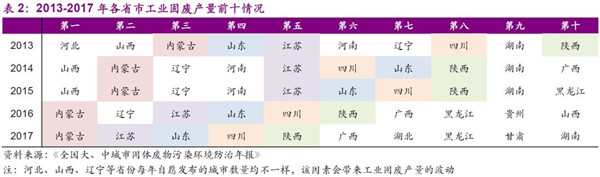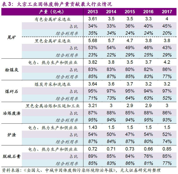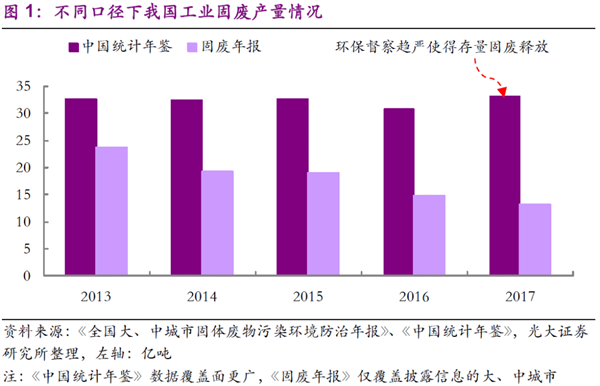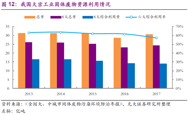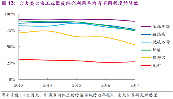從《中國統(tǒng)計年鑒》數(shù)據(jù)中我們可以得出同樣的趨勢。2013年起我國一般工業(yè)固體廢物產(chǎn)生量為32.77億噸,到2016年已減少至30.92億噸。2017年我國一般工業(yè)固廢產(chǎn)生量突然增長至33.16萬噸,我們認(rèn)為其主要原因是2017年的環(huán)保督察趨嚴(yán)使得大量存量固體釋放進而拉高當(dāng)年產(chǎn)量,但是工業(yè)固廢減量化的大趨勢是不改的。