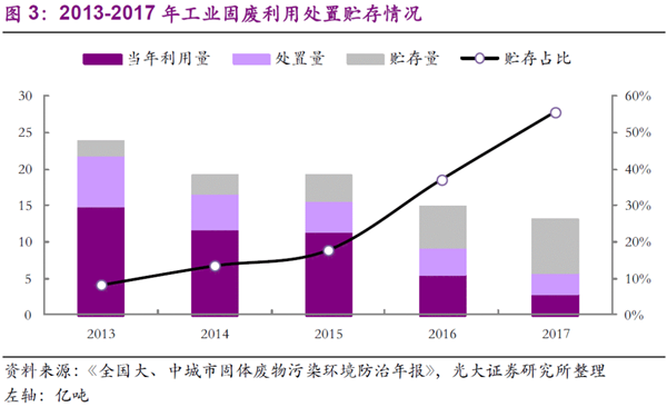 但是,工業(yè)固廢利用處置的占比在逐年下降?!豆虖U年報》數(shù)據(jù)顯示,2013年僅有8%的工業(yè)固廢未被利用或處置從而貯存,而2017年貯存工業(yè)固廢占比上升至58%,處置占比從30%下降至24%,綜合利用占比雖穩(wěn)定在60%,但對往年貯存工業(yè)固廢的利用量在逐步提高,故每年有更多的工業(yè)固廢貯存。