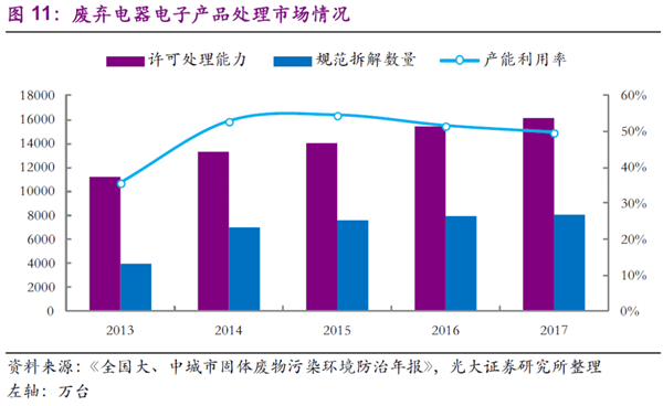 資源化廢物利用方面,我國廢棄電器電子產(chǎn)品處理市場穩(wěn)健增長,截止2017年底,共109家企業(yè)納入廢棄電器電子產(chǎn)品處理基金補貼企業(yè)名單,合計年處理能力達(dá)1.61億臺,比2013年的1.12億臺增長44%。同時,規(guī)范拆解廢棄電器電子產(chǎn)品的數(shù)量也由2013年的3987萬臺增長到2017年的7995萬臺,產(chǎn)能利用率也有一定程度的增長,行業(yè)正逐步朝著規(guī)范化、集中化的趨勢發(fā)展。
