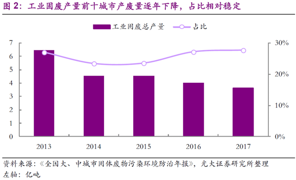 我國在“十二五”規(guī)劃中提出工業(yè)固廢要大力推行減量化處理原則,2013年起我國的工業(yè)固廢產(chǎn)量呈下降趨勢。雖然2017年由于環(huán)保督察趨嚴(yán)的因素導(dǎo)致大量存量固廢釋放,但工業(yè)固廢減量化的大趨勢不改。另一方面,我國歷年大、中城市的工業(yè)固廢貯存量占比已從2013年的8%提高至2017年的56%,工業(yè)固廢利用處置的占比仍需進一步提高。