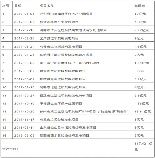 據(jù)統(tǒng)計,2017年至今,盛運環(huán)?;蛑袠?biāo)或簽署了多達18個項目,其中多數(shù)為垃圾焚燒項目,少數(shù)為污水處理、環(huán)衛(wèi)服務(wù)項目,總投資達117.42億元人民幣。