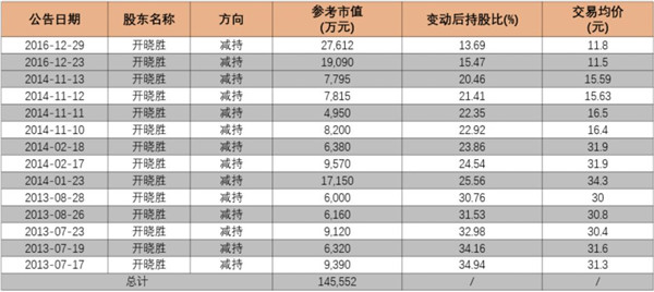與接連失信相對應(yīng)的卻是“精準(zhǔn)減持”。從2013年7月到2016年年底,開曉勝累計減持了14次,套現(xiàn)總金額約為14.56億元。持股比例從2013年的36.12%,減少到2016年12月28日的13.69%。最后一次減持無限售條件股份0.04%,幾乎清倉。