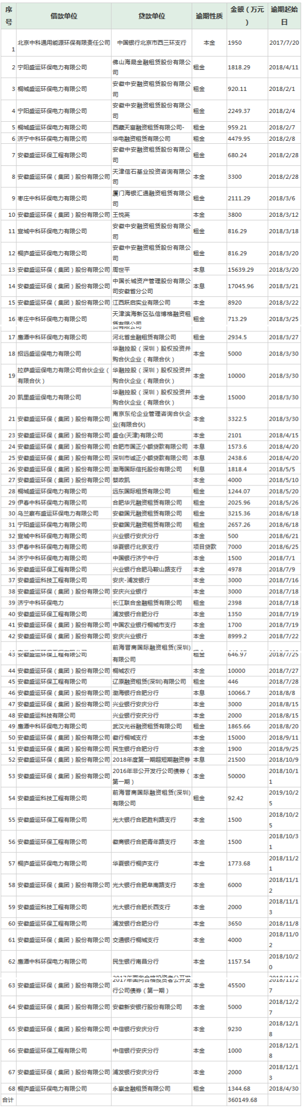 除卻債券違約,盛運環(huán)保還存在大量逾期債務(wù)。公司最新發(fā)布的公告顯示,截止2019年1月5日,盛運環(huán)保逾期債務(wù)共計68筆,逾期起始日最早2017年7月20日,最晚2018年12月27日,逾期性質(zhì)包括:本金、利息和租金,逾期債務(wù)共計36.01億元。