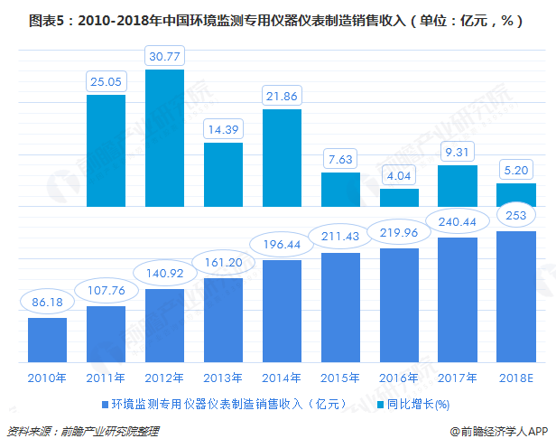 國家統(tǒng)計局的統(tǒng)計數(shù)據(jù)顯示,2017年我國環(huán)境保護專用設(shè)備制造業(yè)的銷售收入達到2780億元左右,其中環(huán)境監(jiān)測專用儀器儀表制造銷售收入在240億元左右,環(huán)境污染處理專用藥劑材料制造銷售收入在418億元左右。從2010年以來行業(yè)銷售收入的增速變化可以明顯看出,隨著我國環(huán)保設(shè)備投放量和保有量的不斷增長,我國設(shè)備制造銷售增速出現(xiàn)明顯下滑,但整體仍處于上升區(qū)間。