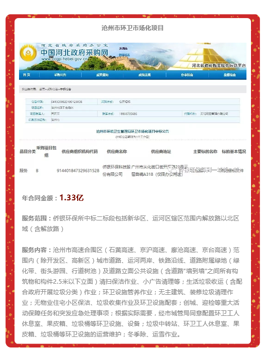 新年伊始,僑銀環(huán)保首戰(zhàn)告捷,憑借先進(jìn)的管理理念、良好的市場信譽、精湛的技術(shù)水平與合理的項目報價,成功中標(biāo)滄州市環(huán)境衛(wèi)生管理局環(huán)衛(wèi)市場化項目(二標(biāo)段),實現(xiàn)新年“開門紅”。