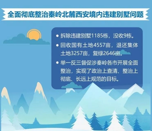 全面徹底整治秦嶺北麓西安境內(nèi)違建別墅問題,拆除違建別墅1185棟,沒收9 棟,回收國有土地4557畝,退還集體土地3257畝,復(fù)綠2646畝。