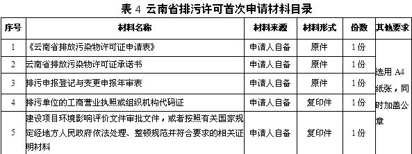 云南省排污許可首次申請(qǐng)材料目錄見(jiàn)表4。