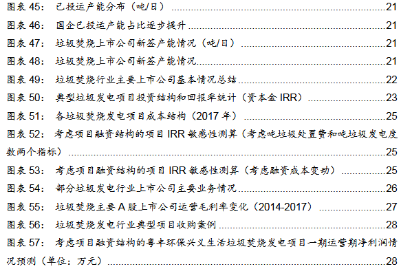 情景:考慮項目融資結(jié)構(gòu)的資本金IRR測算:我們假設(shè)項目的資本結(jié)構(gòu)為70%債務(wù),30%自有資金,參考中國天楹/綠色動力的公司財務(wù)狀況,假設(shè)其項目的債務(wù)資金的綜合成本分別為6.5%/5.6%,各個項目每年將新增部分財務(wù)費用,我們計算得到各個項目慮融資杠桿后的IRR,其中最高的為綠色動力海寧項目IRR為30.0%,主因為其噸垃圾發(fā)電量和噸投資額均為所列示可比項目最低。中國天楹延吉項目和康恒廣水項目IRR相對較低分別為17.1%/20.3%,主因其垃圾處置費明顯較低,且中國天楹延吉項目噸垃圾發(fā)電量顯著低于其他項目。根據(jù)我們的敏感性分析,假設(shè)垃圾處置費增加5元/噸,各個垃圾發(fā)電項目IRR增加0.6 pct -0.9pct;噸垃圾發(fā)電+20千瓦時/噸,各個項目的IRR增加.5pct ~2.3 pct。