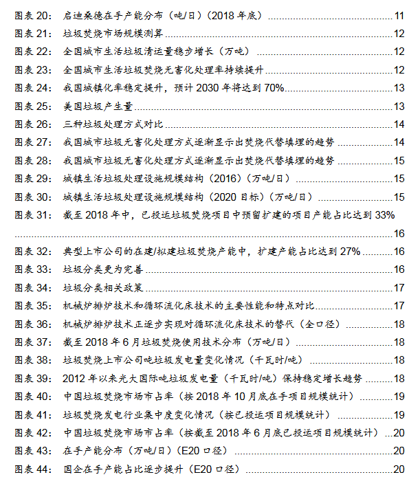 競爭格局:集中度較高,國企競爭力增強(qiáng)根據(jù)2018年10月的垃圾焚燒項目在手規(guī)模排序,目前垃圾焚燒行業(yè)主要的參與者包括:1)國企:光大國際、中國環(huán)境保護(hù)集團(tuán)、綠色動力環(huán)保、皖能環(huán)保、康恒環(huán)境、北京控股、重慶三峰、上海環(huán)境、啟迪桑德、廣州環(huán)保、瀚藍(lán)環(huán)境等;2)民企:錦江環(huán)境、盛運環(huán)保、中國