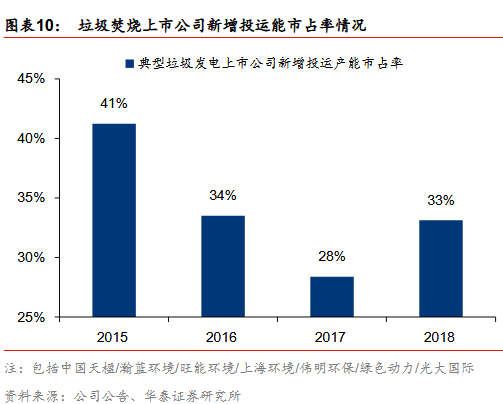 新增訂單趨勢:國企拿單能力強(qiáng)于民企。我們對光大國際、綠色動力、瀚藍(lán)環(huán)境、上海環(huán)境、盛運環(huán)保、中國天楹、旺能環(huán)境、偉明環(huán)保幾家典型垃圾發(fā)電上市公司2015-2018年新簽訂單進(jìn)行分析,其中光大國際、綠色動力、瀚藍(lán)環(huán)境、上海環(huán)境四家國企2015年新簽訂單1.8萬噸/日,占8家上市公司新簽訂單總產(chǎn)能的45%,2016年提升至52%、2017年繼續(xù)提升至56%,2018年四家國企新簽訂單總產(chǎn)能為5.5萬噸/日,占比提升至80%,國企拿單能力顯著強(qiáng)于民企。
