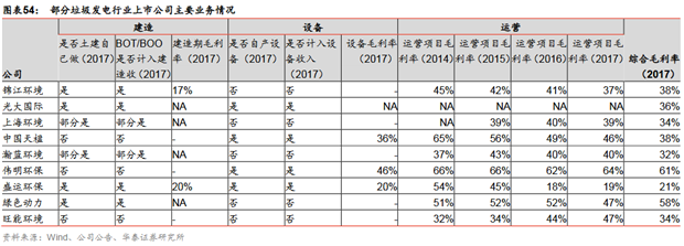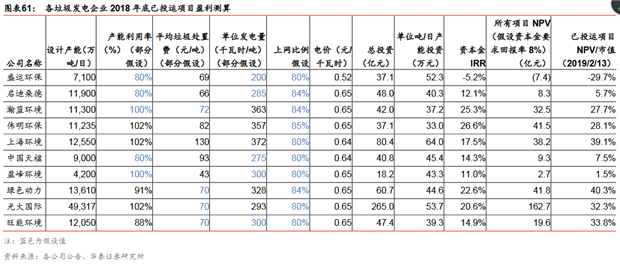 項目達(dá)產(chǎn)后主要收入來自發(fā)電收入,主要成本來自折舊、原材料和人工:首先假設(shè)該項目資金100%來自自有資金投資的情況下,則項目主要的收入、成本情況如下:1)收入:垃圾處置收入+發(fā)電收入。項目達(dá)產(chǎn)后,滿產(chǎn)狀態(tài)下可得出項目的年垃圾處理量,按照各個項目的垃圾處置費(所列項目中最高為康恒寧波項目的149元/噸,最低為中國天楹延吉項目的58元/噸),則項目除增值稅后可測得年垃圾處置收入;按照0.65元/度的發(fā)電收入(部分項目比如康恒寧波項目、綠色動力永嘉、綠色動力海寧項目為0.66元/度),結(jié)合各項目噸垃圾發(fā)電量(所列項目中最高為綠色動力海寧項目的410度/噸,最低為中國天楹延吉項目的280度/噸),結(jié)合個項目的上網(wǎng)比例(79%-85%之間),可測得扣除增值稅后年垃圾發(fā)電收入;可以看出,噸垃圾處置費和噸垃圾發(fā)電量是決定收入端的主要變量。2)成本:以中國天楹延吉項目為例,根據(jù)其非公開發(fā)行報告書披露,成本構(gòu)成中折舊占比47%(天楹按照資產(chǎn)預(yù)計使用壽命與該BOT項目特許經(jīng)營權(quán)協(xié)議規(guī)定的經(jīng)營期孰低確定,基本上折舊年限在20年)、原材料占比20%、工資及福利占比15%、維護(hù)費用(考慮大修、年修及日常維護(hù)費用)占比11%、污水及爐渣處置占比7%。總體來看,成本端中折舊攤銷、原材料和人工占比在80%左右。