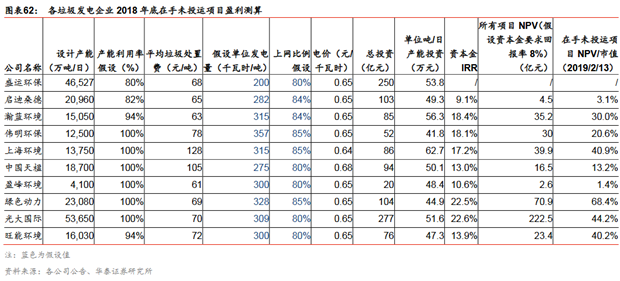 資產(chǎn)角度:項目回報率和公司NPV估值測算已投運和在手項目IRR和NPV的主要假設(shè):1)所有項目建設(shè)期2年(含有半年試運營期),運營期30年;2)項目投資額未公布,則參考已知項目的平均單位投資額,大約單位噸/日處理能力在30-50萬元;3)項目資本結(jié)構(gòu)參考公司2016年底的資產(chǎn)負(fù)債率以及有息負(fù)債情況假設(shè);4)折舊年限按照公司的會計準(zhǔn)則描述以及攤銷費用占無形資產(chǎn)比例倒推得出;5)貸款費用參考公司2017年的綜合財務(wù)成本(利息費用/有息負(fù)債均值);6)運營期成本結(jié)構(gòu)參考中國天楹延吉項目,沒有考慮各公司運營管理能力的差異,統(tǒng)一假設(shè):原材料、工資及福利、維修和環(huán)保費用占比分別為14%/10%/10%;7)所得稅三免三減半,增值稅發(fā)電即征即退100%,垃圾處理費即征即退70%;7)NPV均假設(shè)資本金要求回報率為8%計算。