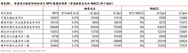 典型項目的NPV考慮項目融資結(jié)構(gòu)的項目NPV測算:我們假設(shè)項目的資本結(jié)構(gòu)為70%債務(wù),30%自有資金,參考中國天楹/綠色動力的公司財務(wù)狀況,假設(shè)其項目的債務(wù)資金的綜合成本分別為6.5%/5.6%,各個項目每年將新增部分財務(wù)費用。依據(jù)之前的投資數(shù)據(jù)和現(xiàn)金流數(shù)據(jù),我們計算得到各個項目考慮融資杠桿后的NPV,其中最高的為康恒寧波項目,其NPV為6.8億元,主要是因為其噸垃圾處置費高于其他所有項目,并且噸垃圾發(fā)電量也處于相對較高水平;而天楹延吉項目、康恒廣水項目、綠色動力海寧、綠色動力永嘉項目一期的NPV均較低,分別為1.08億元、1.01億元、1.31億元、0.97億元,主要因為前兩個項目的噸垃圾處置費和噸垃圾發(fā)電量均較低,而后兩個項目的噸垃圾處置費較低。我們再次計算了各項目的單位產(chǎn)能NPV,發(fā)現(xiàn)天楹延吉項目、康恒廣水項目、綠色動力永嘉項目一期的該指標(biāo)分別僅有13.56萬元/噸、16.89萬元/噸、19.48萬元/噸,而康恒寧波項目、綠色動力永嘉項目二期、綠色動力海寧項目則分別達(dá)到30.24萬元/噸、28.83萬元/噸、26.14萬元/噸,再一次反映了后三個項目相對更高的噸垃圾處置費和噸垃圾發(fā)電量所帶來的更高的項目價值。根據(jù)我們的敏感性分析,假設(shè)垃圾處置費增加5元/噸,各個垃圾發(fā)電項目的NPV增加410-2809萬元;噸垃圾發(fā)電增加20千瓦時/噸,各個項目的NPV增加區(qū)間為611-4830萬元。我們考慮融資成本和WACC兩個指標(biāo)再次對各個項目的NPV進(jìn)行敏感性分析,發(fā)現(xiàn)融資成本增加0.3pct時, 各個項目的NPV降低322萬元-2120萬元;WACC增加0.5pct時,各個項目的NPV降低789萬元-5033萬元。
