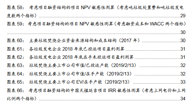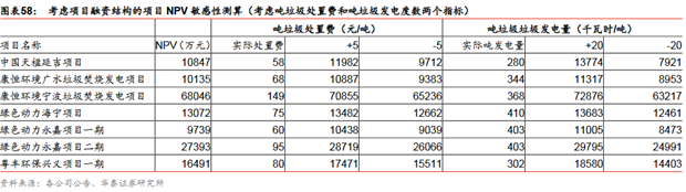 典型項(xiàng)目的NPV考慮項(xiàng)目融資結(jié)構(gòu)的項(xiàng)目NPV測(cè)算:我們假設(shè)項(xiàng)目的資本結(jié)構(gòu)為70%債務(wù),30%自有資金,參考中國(guó)天楹/綠色動(dòng)力的公司財(cái)務(wù)狀況,假設(shè)其項(xiàng)目的債務(wù)資金的綜合成本分別為6.5%/5.6%,各個(gè)項(xiàng)目每年將新增部分財(cái)務(wù)費(fèi)用。依據(jù)之前的投資數(shù)據(jù)和現(xiàn)金流數(shù)據(jù),我們計(jì)算得到各個(gè)項(xiàng)目考慮融資杠桿后的NPV,其中最高的為康恒寧波項(xiàng)目,其NPV為6.8億元,主要是因?yàn)槠鋰嵗幹觅M(fèi)高于其他所有項(xiàng)目,并且噸垃圾發(fā)電量也處于相對(duì)較高水平;而天楹延吉項(xiàng)目、康恒廣水項(xiàng)目、綠色動(dòng)力海寧、綠色動(dòng)力永嘉項(xiàng)目一期的NPV均較低,分別為1.08億元、1.01億元、1.31億元、0.97億元,主要因?yàn)榍皟蓚€(gè)項(xiàng)目的噸垃圾處置費(fèi)和噸垃圾發(fā)電量均較低,而后兩個(gè)項(xiàng)目的噸垃圾處置費(fèi)較低。我們?cè)俅斡?jì)算了各項(xiàng)目的單位產(chǎn)能NPV,發(fā)現(xiàn)天楹延吉項(xiàng)目、康恒廣水項(xiàng)目、綠色動(dòng)力永嘉項(xiàng)目一期的該指標(biāo)分別僅有13.56萬(wàn)元/噸、16.89萬(wàn)元/噸、19.48萬(wàn)元/噸,而康恒寧波項(xiàng)目、綠色動(dòng)力永嘉項(xiàng)目二期、綠色動(dòng)力海寧項(xiàng)目則分別達(dá)到30.24萬(wàn)元/噸、28.83萬(wàn)元/噸、26.14萬(wàn)元/噸,再一次反映了后三個(gè)項(xiàng)目相對(duì)更高的噸垃圾處置費(fèi)和噸垃圾發(fā)電量所帶來(lái)的更高的項(xiàng)目?jī)r(jià)值。根據(jù)我們的敏感性分析,假設(shè)垃圾處置費(fèi)增加5元/噸,各個(gè)垃圾發(fā)電項(xiàng)目的NPV增加410-2809萬(wàn)元;噸垃圾發(fā)電增加20千瓦時(shí)/噸,各個(gè)項(xiàng)目的NPV增加區(qū)間為611-4830萬(wàn)元。我們考慮融資成本和WACC兩個(gè)指標(biāo)再次對(duì)各個(gè)項(xiàng)目的NPV進(jìn)行敏感性分析,發(fā)現(xiàn)融資成本增加0.3pct時(shí), 各個(gè)項(xiàng)目的NPV降低322萬(wàn)元-2120萬(wàn)元;WACC增加0.5pct時(shí),各個(gè)項(xiàng)目的NPV降低789萬(wàn)元-5033萬(wàn)元。