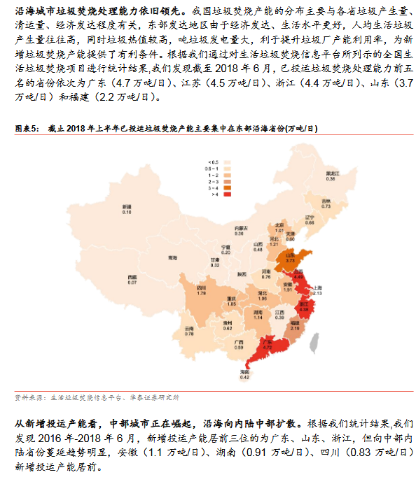 “鄰避效應(yīng)”的有效應(yīng)對(duì)有效緩解了垃圾發(fā)電產(chǎn)能擴(kuò)張的阻礙因素。由于環(huán)境壓力的日益加重,推動(dòng)垃圾發(fā)電行業(yè)發(fā)展已成為業(yè)內(nèi)的共識(shí)。但由于部分民眾對(duì)垃圾焚燒發(fā)電的認(rèn)識(shí)不足,抵制并阻撓所在地區(qū)焚燒發(fā)電廠的建設(shè)運(yùn)營(yíng),“鄰避效應(yīng)”加大了垃圾焚燒發(fā)電廠的選址難度,制約了行業(yè)的快速發(fā)展。但在當(dāng)前“鄰避效應(yīng)”能夠更有效應(yīng)對(duì):1)行業(yè)發(fā)展更為成熟、環(huán)保督查趨嚴(yán),公信力提升機(jī)向群眾宣傳和信息公開(kāi)透明制度更為完善;2)擴(kuò)建比例較高,在原址附近擴(kuò)建鄰避效應(yīng)會(huì)有效減弱。截至2018年中,已投運(yùn)的所有垃圾焚燒項(xiàng)目中,預(yù)留擴(kuò)建的項(xiàng)目產(chǎn)能占比達(dá)到33%,其中已投運(yùn)的擴(kuò)建項(xiàng)目產(chǎn)能占比為10%,尚處于在建/擬建的項(xiàng)目擴(kuò)建產(chǎn)能占比為23%。一方面,在垃圾焚燒處理能力不足以滿足實(shí)際需求的情況下,很多項(xiàng)目選擇在現(xiàn)有焚燒處理廠的基礎(chǔ)上進(jìn)行擴(kuò)建;另一方面,多數(shù)項(xiàng)目在最初規(guī)劃選址時(shí)就會(huì)在一期項(xiàng)目的焚燒處理廠附近預(yù)留出二期項(xiàng)目甚至三期項(xiàng)目的場(chǎng)地。而已有廠區(qū)周邊的居民對(duì)于這些擴(kuò)建項(xiàng)目的接受度相對(duì)更高,鄰避效應(yīng)的作用也會(huì)因此得到較大緩解。