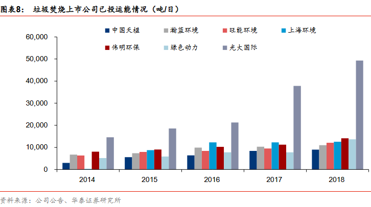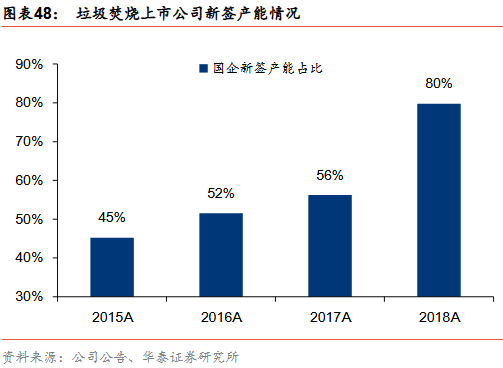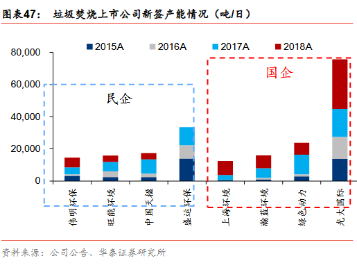 新增訂單趨勢(shì):國(guó)企拿單能力強(qiáng)于民企。我們對(duì)光大國(guó)際、綠色動(dòng)力、瀚藍(lán)環(huán)境、上海環(huán)境、盛運(yùn)環(huán)保、中國(guó)天楹、旺能環(huán)境、偉明環(huán)保幾家典型垃圾發(fā)電上市公司2015-2018年新簽訂單進(jìn)行分析,其中光大國(guó)際、綠色動(dòng)力、瀚藍(lán)環(huán)境、上海環(huán)境四家國(guó)企2015年新簽訂單1.8萬(wàn)噸/日,占8家上市公司新簽訂單總產(chǎn)能的45%,2016年提升至52%、2017年繼續(xù)提升至56%,2018年四家國(guó)企新簽訂單總產(chǎn)能為5.5萬(wàn)噸/日,占比提升至80%,國(guó)企拿單能力顯著強(qiáng)于民企。