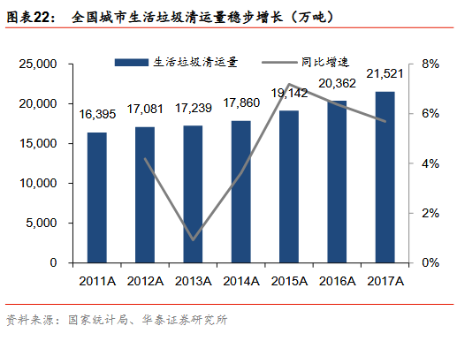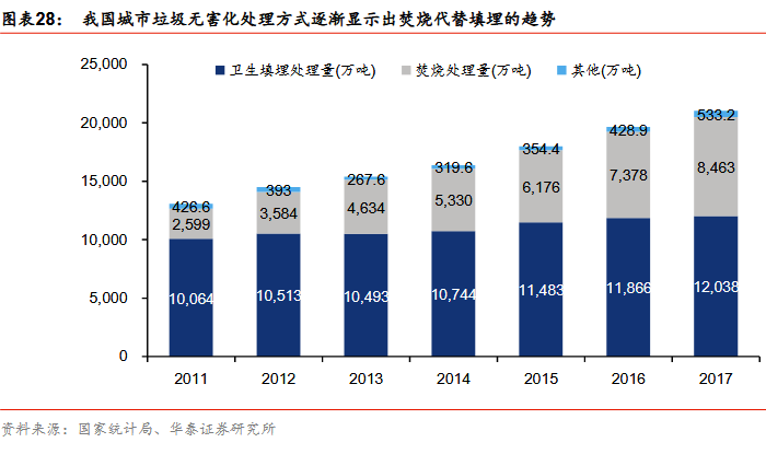 驅(qū)動(dòng)因素一:需求的持續(xù)擴(kuò)張垃圾焚燒發(fā)電行業(yè)持續(xù)擴(kuò)張主要推動(dòng)因素包括:1)垃圾產(chǎn)生量和清運(yùn)量持續(xù)提升:我國(guó)城市垃圾清運(yùn)量由2011年的1.64億噸上升到2017年的2.15億噸,年均復(fù)合增速4.6%,城鎮(zhèn)化的持續(xù)推進(jìn)、生活水平的逐步提高,我們認(rèn)為,城市垃圾產(chǎn)生量和清運(yùn)量仍將保持增長(zhǎng);2)垃圾焚燒占有率快速提升,垃圾焚燒占生活垃圾無(wú)害化處理量的比例從2011年的20%增長(zhǎng)到2017年的40%。