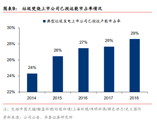 垃圾焚燒行業(yè)的參與者以國(guó)企和民企為主,國(guó)企在手產(chǎn)能市占率提升明顯,由16年的66.7%提升至18年的71.3%。從在手項(xiàng)目量(E20口徑)的角度看,2018年國(guó)企市占率大約71.3%,民企市占率大約28.5%,外企市占率大約0.2%。且從變化趨勢(shì)上看,國(guó)企在手產(chǎn)能市占率提升明顯,由16年的66.7%提升至18年的71.3%,主要與國(guó)企的資金優(yōu)勢(shì)、拿單優(yōu)勢(shì)相關(guān)聯(lián)。