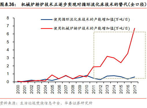 國(guó)際上機(jī)械爐排爐技術(shù)已經(jīng)非常成熟并且被廣泛使用,相比循環(huán)流化床技術(shù),機(jī)械爐排爐技術(shù)擁有單臺(tái)焚燒爐的垃圾處理量大、進(jìn)料垃圾不需要進(jìn)行預(yù)處理、對(duì)垃圾的成分要求低、污染物排放和灰渣熱灼減率等指標(biāo)更易達(dá)標(biāo)、燃燒狀態(tài)穩(wěn)定、運(yùn)行成本低、年運(yùn)行時(shí)間長(zhǎng)、操作簡(jiǎn)便等優(yōu)勢(shì)。而國(guó)內(nèi)2012年發(fā)布的《國(guó)家發(fā)展改革委關(guān)于完善垃圾焚燒發(fā)電價(jià)格政策的通知》和2014年發(fā)布的《生活垃圾焚燒污染控制標(biāo)準(zhǔn)》等政策也使得循環(huán)流化床技術(shù)的運(yùn)行成本增加,因而近年來(lái)機(jī)械爐排爐技術(shù)正在逐步實(shí)現(xiàn)對(duì)循環(huán)流化床技術(shù)的替代。
