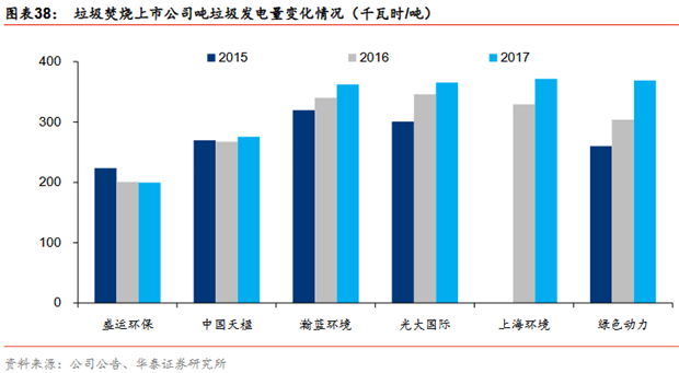 垃圾分類+技術(shù)的進(jìn)步=噸垃圾發(fā)電量提升,上市公司層面可以觀察到幾家典型垃圾發(fā)電企業(yè)在2015-2017年噸垃圾發(fā)電量顯著提升,其中綠色動(dòng)力、光大國(guó)際分別由16年的260千瓦時(shí)/噸、301千瓦時(shí)/噸提升至17年的369千瓦時(shí)/噸、365千瓦時(shí)/噸。長(zhǎng)周期來(lái)看,光大國(guó)際噸垃圾發(fā)電量由2012年的278千瓦時(shí)/噸提升至2017年的365千瓦時(shí)/噸,提升幅度明顯。