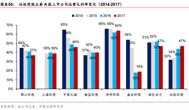 上市公司會(huì)計(jì)政策差異:垃圾焚燒會(huì)計(jì)處理方法各不相同。下面我們選取了行業(yè)里一些主要的上市公司分析,匯總?cè)缦卤?,其中:BOT計(jì)入工程收入的主要有錦江環(huán)境、光大國(guó)際、上海環(huán)境、瀚藍(lán)環(huán)境、盛運(yùn)環(huán)保、綠色動(dòng)力;BOT計(jì)入設(shè)備銷售收入的主要有:光大國(guó)際、中國(guó)天楹、偉明環(huán)保、盛運(yùn)環(huán)保,其中偉明環(huán)保的設(shè)備銷售的毛利率較高,大約在46%左右;各公司的運(yùn)營(yíng)毛利率有一定差異,大部分公司2016年毛利率出現(xiàn)了同比下滑,預(yù)計(jì)由于新投運(yùn)項(xiàng)目的盈利能力不如老項(xiàng)目所致。其中偉明環(huán)保垃圾發(fā)電項(xiàng)目毛利率高出行業(yè)平均較多,主要是因?yàn)樵O(shè)備折舊費(fèi)用少,設(shè)備折舊費(fèi)用可以占到垃圾焚燒成本的40%-50%,而偉明環(huán)保的設(shè)備折舊較少主要有兩點(diǎn)原因:1)偉明環(huán)保自產(chǎn)爐排爐設(shè)備,同時(shí)不計(jì)設(shè)備銷售收入,因此在在建工程確認(rèn)時(shí)并不包含設(shè)備毛利(一般設(shè)備毛利率約40%),因此最終轉(zhuǎn)入無(wú)形資產(chǎn)特許經(jīng)營(yíng)權(quán)的金額比其他公司大約節(jié)省了40%的設(shè)備投資;2)偉明環(huán)保采取的折舊方法是按照特許經(jīng)營(yíng)權(quán)年限折舊,按照2016年特許經(jīng)營(yíng)權(quán)折舊的數(shù)據(jù)估計(jì),綜合折舊年限在25年,折舊年限長(zhǎng)于啟迪桑德、瀚藍(lán)環(huán)境、中國(guó)天楹、光大國(guó)際(這些公司采取特許經(jīng)營(yíng)權(quán)和資產(chǎn)使用年限孰短的方法折舊,一般綜合折舊年限為20年)。
