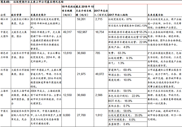 競(jìng)爭(zhēng)格局:集中度較高,國(guó)企競(jìng)爭(zhēng)力增強(qiáng)根據(jù)2018年10月的垃圾焚燒項(xiàng)目在手規(guī)模排序,目前垃圾焚燒行業(yè)主要的參與者包括:1)國(guó)企:光大國(guó)際、中國(guó)環(huán)境保護(hù)集團(tuán)、綠色動(dòng)力環(huán)保、皖能環(huán)保、康恒環(huán)境、北京控股、重慶三峰、上海環(huán)境、啟迪桑德、廣州環(huán)保、瀚藍(lán)環(huán)境等;2)民企:錦江環(huán)境、盛運(yùn)環(huán)保、中國(guó)
