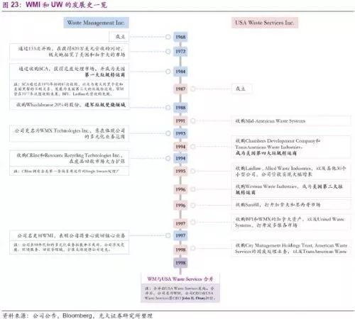 縱觀WM的發(fā)展史,兼并和收購一直貫穿其中。改變公司歷史的一次兼并發(fā)生在1998年,公司與USA Waste Services Inc.(以下簡稱UW)合并,新公司名稱保留為Waste Management。值得注意的是,本次兼并的提出方并不是當(dāng)時(shí)全美第一的固廢龍頭WM提出,而是由當(dāng)時(shí)全美第三的UW提出兼并,同時(shí)新公司的CEO也由原UW的CEO擔(dān)任。為了更好的分析WM的并購發(fā)展,我們將分別研究WM(合并后),原WM(以下簡稱WMI),以及UW分別的發(fā)展并購史。