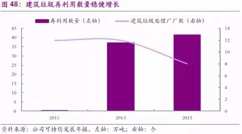 早在2000年初,公司便積極發(fā)展建筑垃圾的回收工作。公司在2009年至2014年間,通過10余家建筑垃圾回收廠占據(jù)了穩(wěn)定市場份額,建筑行業(yè)的季節(jié)性高峰特性也為公司在夏季的營業(yè)收入做出了可觀貢獻(xiàn)。而在2011年,公司又創(chuàng)新式的推出了“分散回收跟蹤工具”,通過跟蹤使用在工程中的重復(fù)利用建筑材料,幫助工程項(xiàng)目方更好地完成綠色建筑的目標(biāo)。截止2015年,通過跟蹤工具的幫助,已有多達(dá) 41萬噸的建筑垃圾得到回收或再利用,比2013年的37萬噸增長10%。