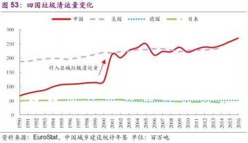 美國、日本、德國同為全球領(lǐng)先的發(fā)達(dá)國家,早在二十世紀(jì)90年代便實(shí)現(xiàn)了100%垃圾清運(yùn)率,所以它們的垃圾產(chǎn)生量也是他們的垃圾清運(yùn)量。美國垃圾清運(yùn)量從二十世紀(jì)90年代起仍在持續(xù)增長,目前維持在2.3億噸左右;德國垃圾清運(yùn)量偶有波動(dòng),基本維持在5千萬噸;日本垃圾清運(yùn)量更是從1990年的5千萬噸減少到2015年的4千萬噸左右。中國垃圾清運(yùn)量伴隨著經(jīng)濟(jì)高速發(fā)展,在2001年起計(jì)入縣城垃圾清運(yùn)量后達(dá)到2億噸水平,總量和美國持平并在2012年實(shí)現(xiàn)超越,成為全球垃圾清運(yùn)第一大國。