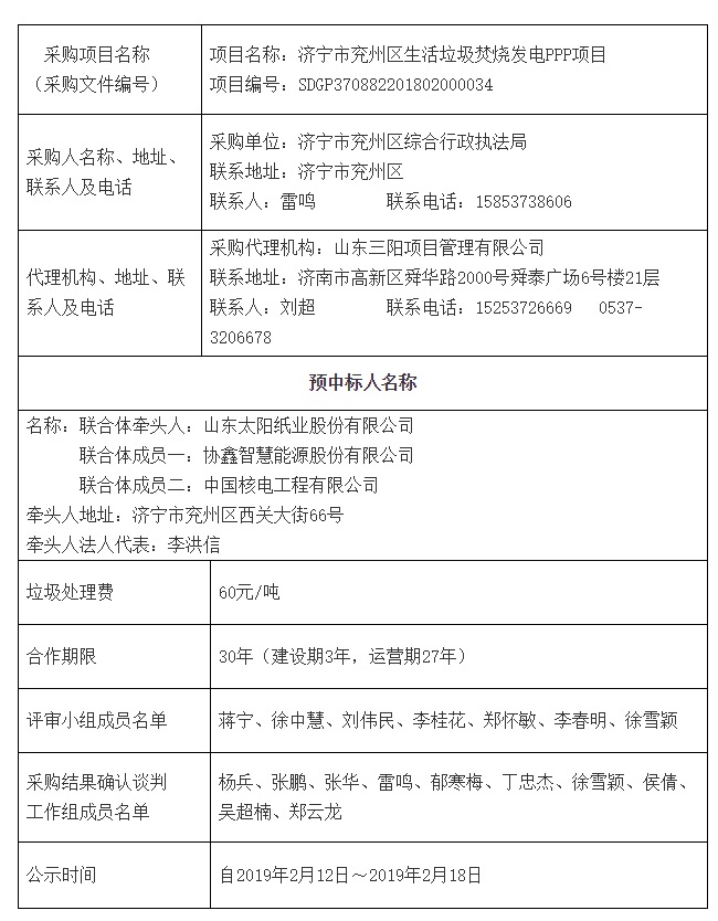 2019年春節(jié)過后,開工的第二天,2月12日,從濟寧公共資源交易網(wǎng)獲悉,山東濟寧市兗州區(qū)生活垃圾焚燒發(fā)電PPP項目預(yù)中標結(jié)果公示,山東太陽紙業(yè)股份有限公司牽頭的,協(xié)鑫智慧能源股份有限公司與中國核電工程有限公司組成的聯(lián)合體中標,垃圾處理費60元/噸。