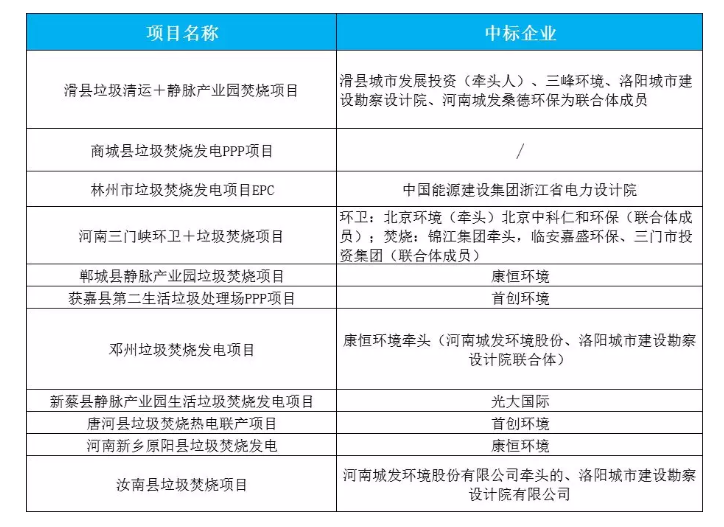 從中標(biāo)企業(yè)來(lái)看,除商城縣垃圾焚燒發(fā)電項(xiàng)目未公布中標(biāo)單位外,其他10座垃圾焚燒廠均已公示中標(biāo)企業(yè)。